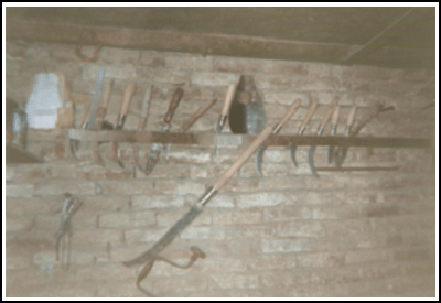 صورة (2) منتجات حرفة الحدادة المنجل والداسولة والعكفة والطبر والمسحاة والكرفة والكرك والمسنون وانواع السكاكين وغيرها ، التقطت الصورة بتاريخ 5/8/2007الجدول (2) منتجات حرفية الحدادة والغرض من صناعتها