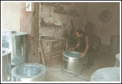 صورة (3) انتاج التنانير المعدنية وخزانات المياه وغيرها معتمدة على العمل اليدوي في حرفة التنكجية ، التقطت الصورة بتاريخ 5/8/2007